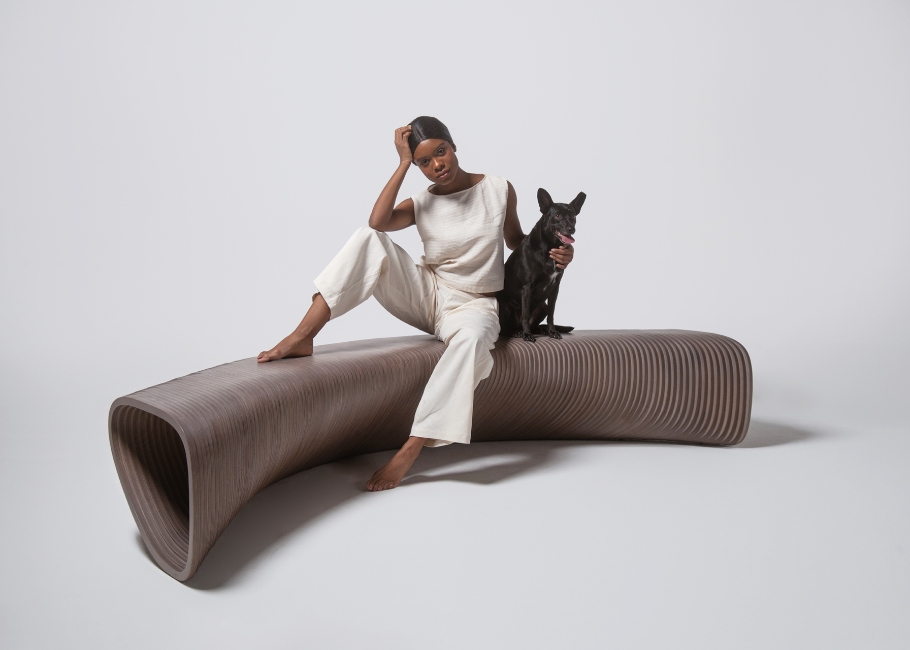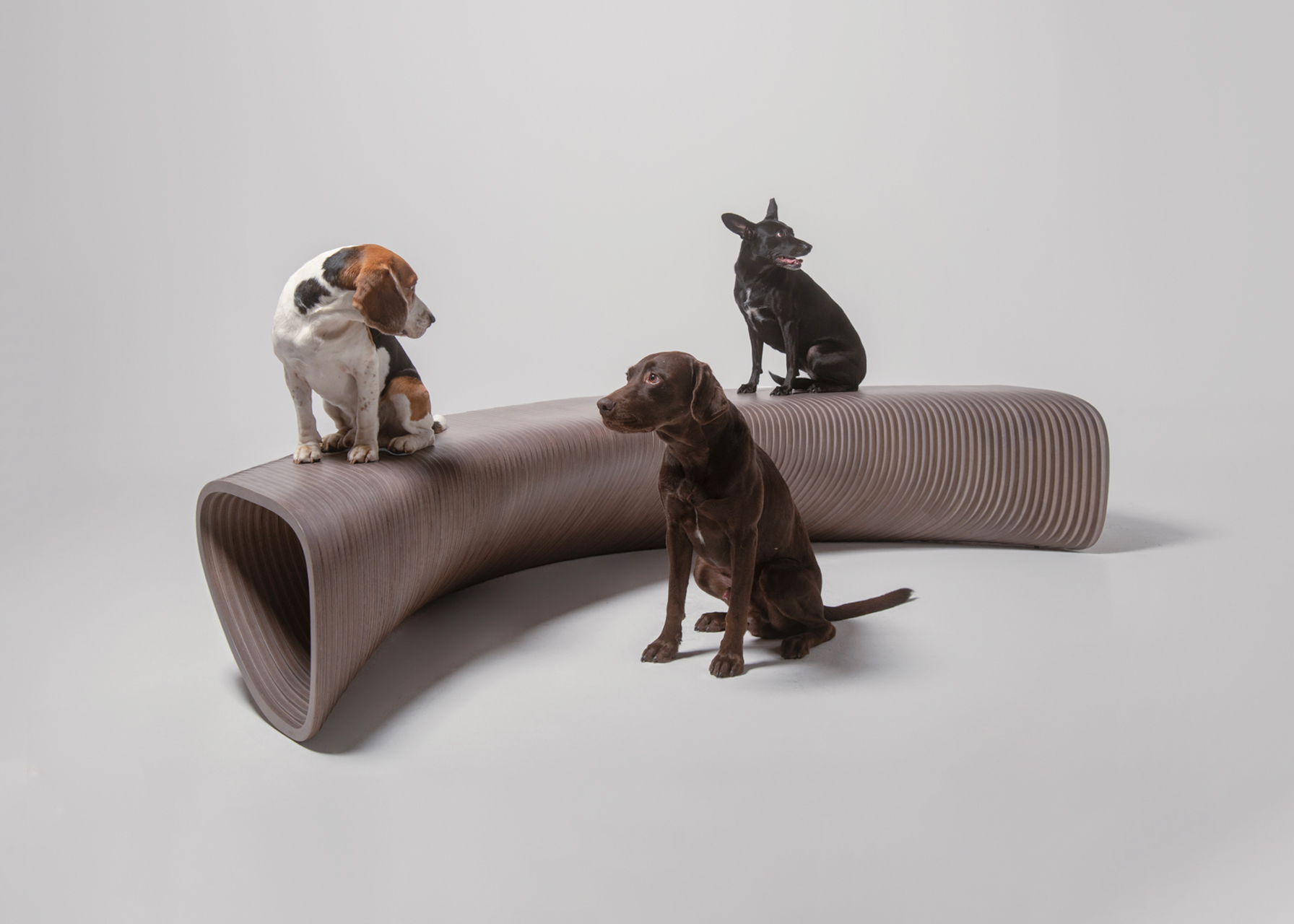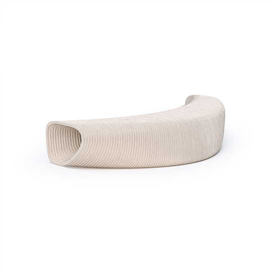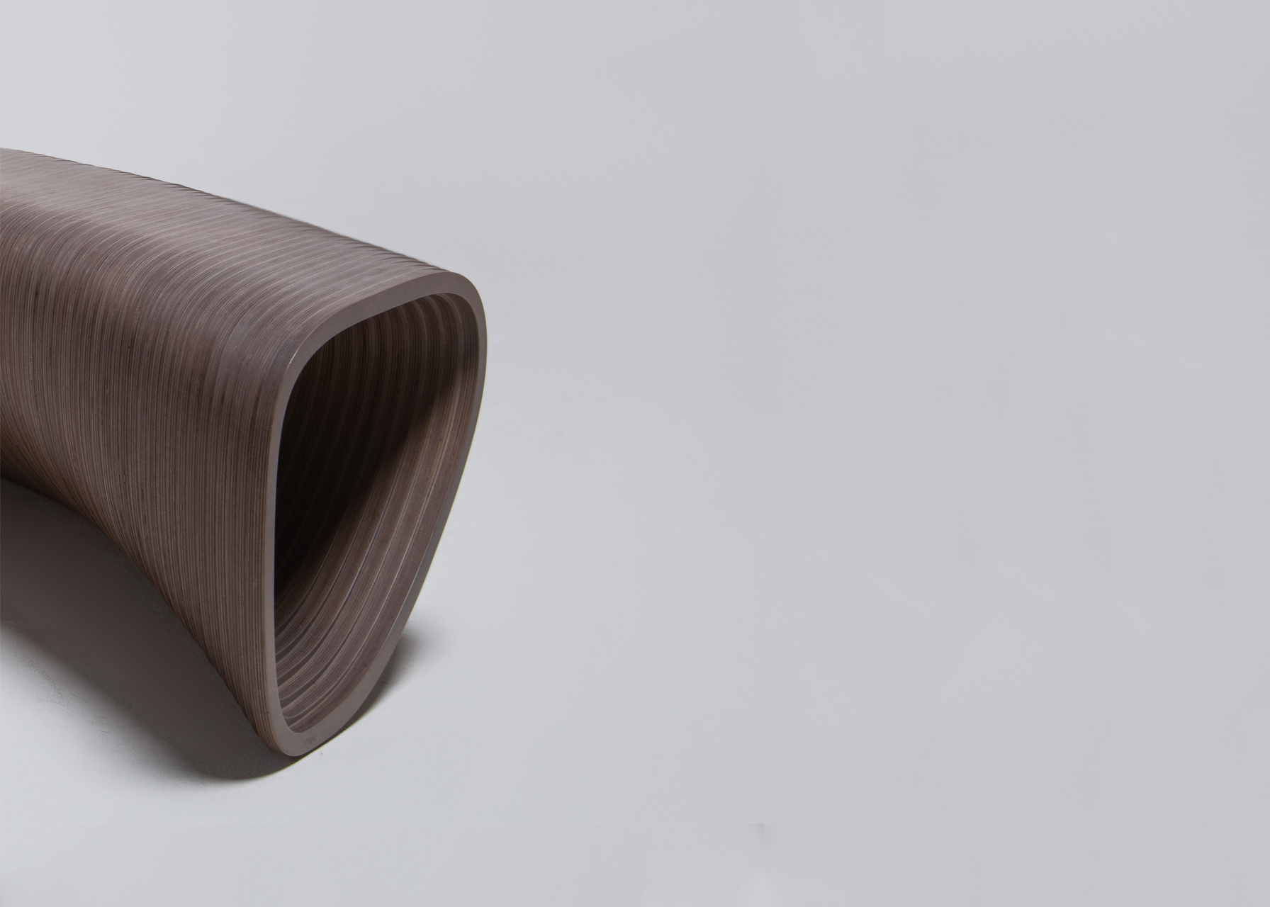 Bench made with 123 vertical sections of laminated birch and spruce wood (18.5 mm thickness each). Matt finish with stain and exterior polyurethane coating.