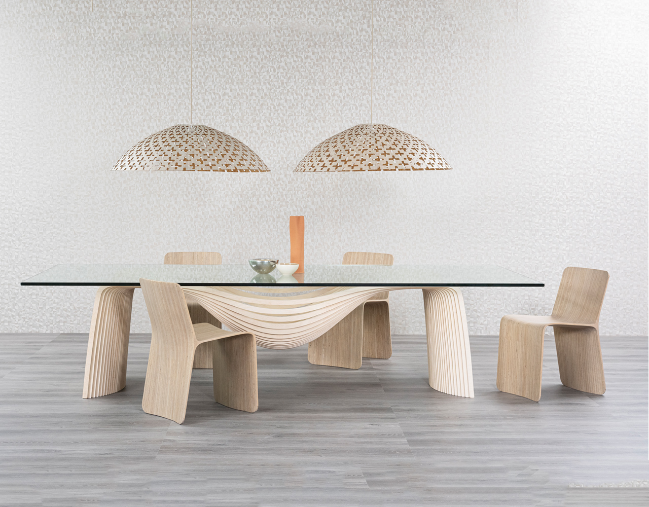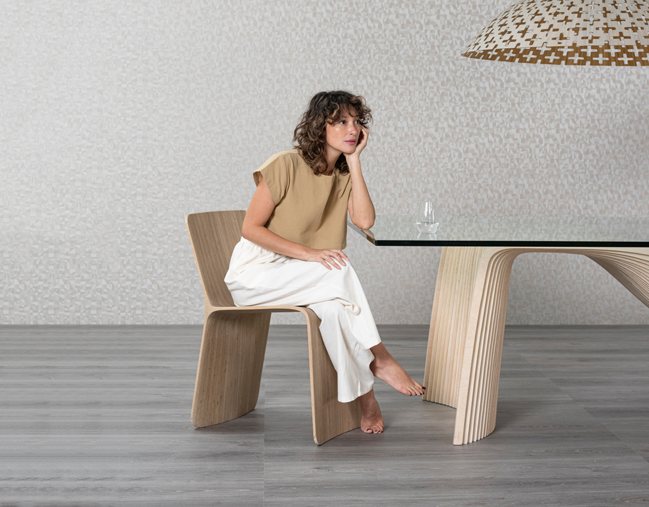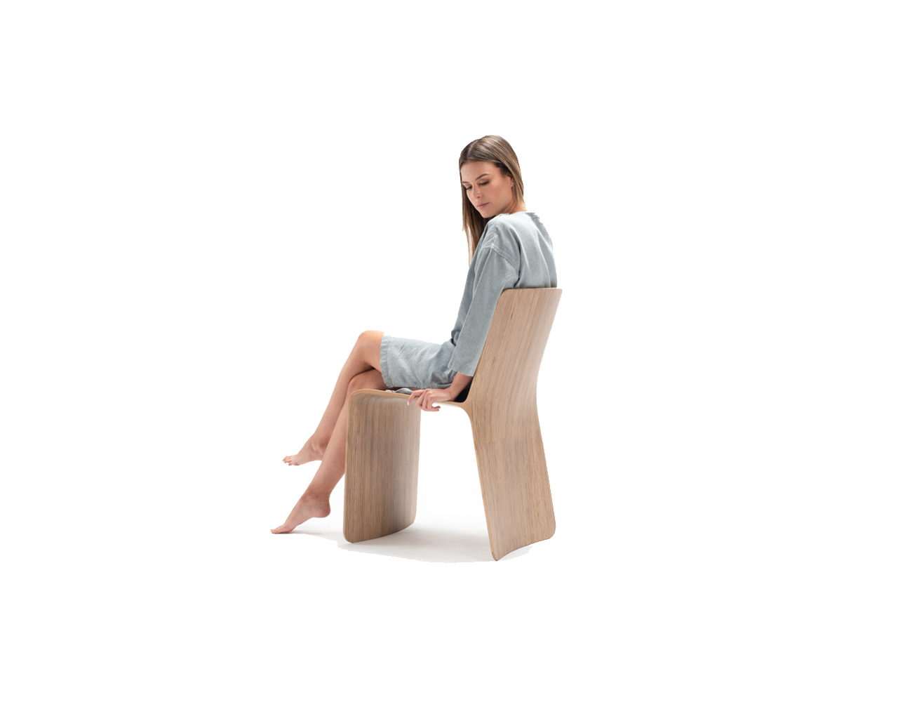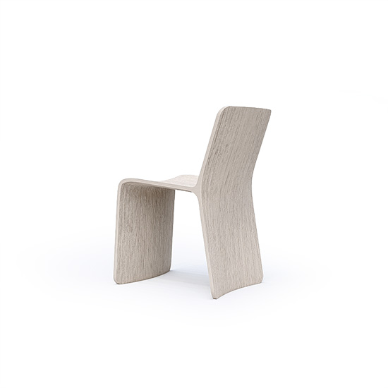 Chair made with 28 vertical sections of laminated birch and spruce wood (15 mm thickness each). Matt finish with stain and exterior polyurethane coating.