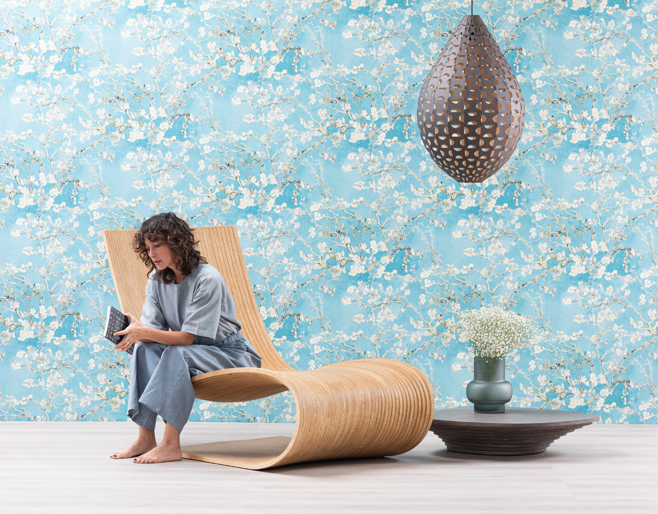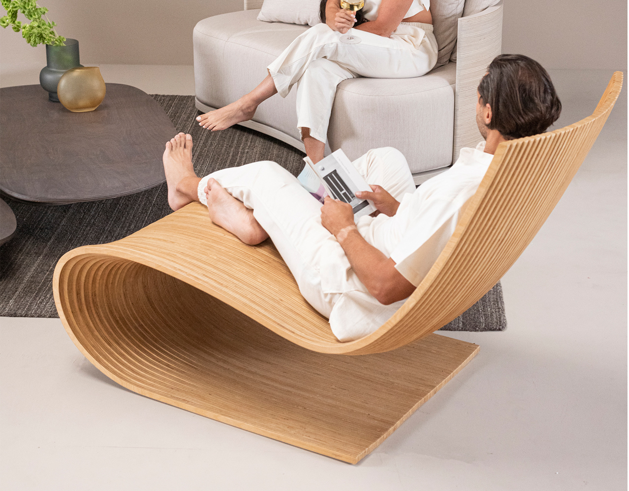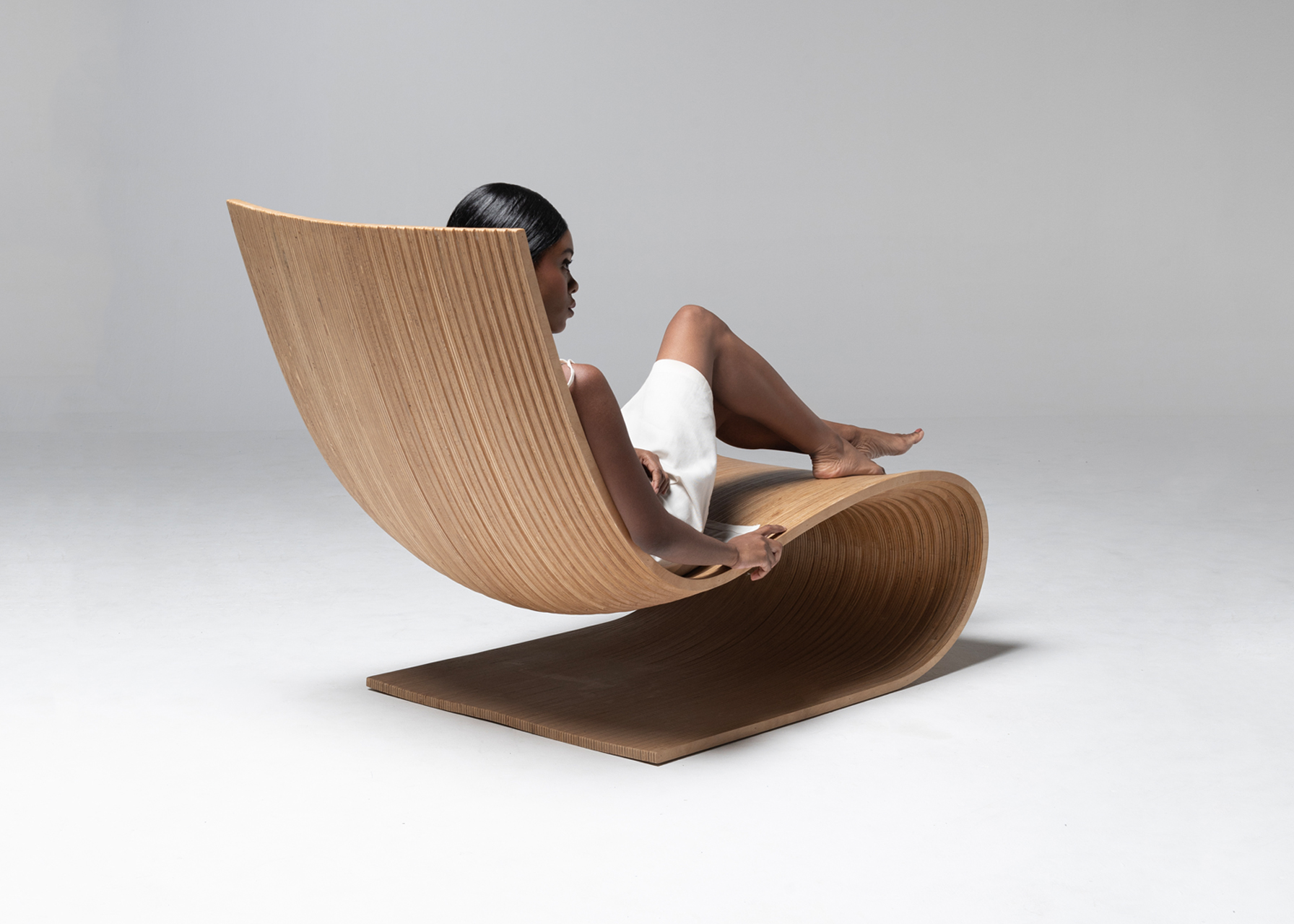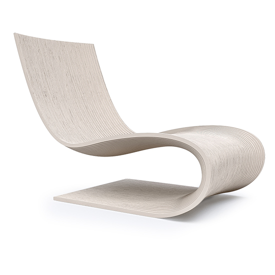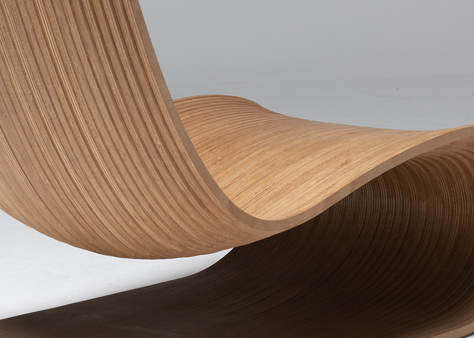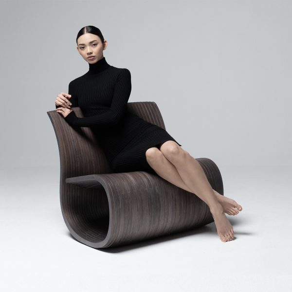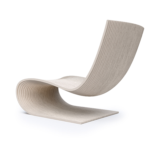 Chair made with 40 vertical sections of laminated birch and spruce wood (18.5 mm thickness each). Matt finish with stain and exterior polyurethane coating.
